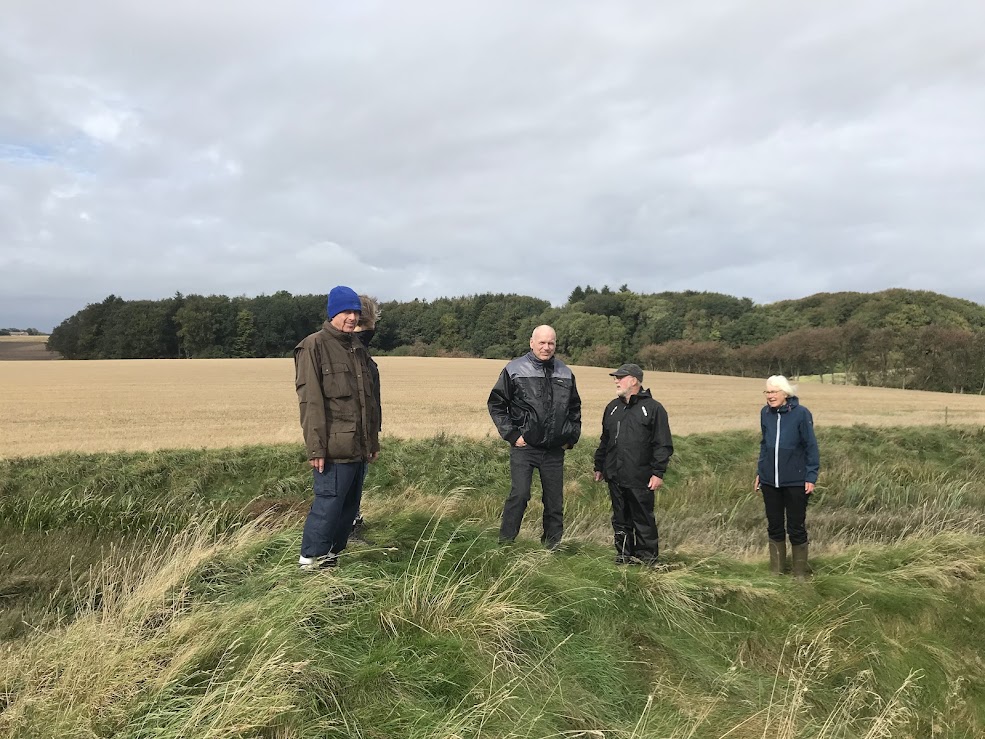 Inden generalforsamlingen den 10/9 gik vi traditionen tro en tur. Denne gang med udgangspunkt fra Sindbjerg Vingård – først gennem den net-dækkede vinmark dernæst ad Grå Stensvej til Vejerslev å delvis på de tilgrænsende marker dels gennem lidt uvejsom høj vegetation. Vi var lidt i konkurrence med vejret – stadig tørvejr – men med udsigt til regn, inden vi nåede til generalforsamlingen. Målet for gåturen var – for de fleste ukendte – Gammelvold på Vejerslevgårds mark. Efter at have krydset Vejerslev på en smal bro, fik vi over bakkekammen øje på det senmiddelalderlige voldsted.